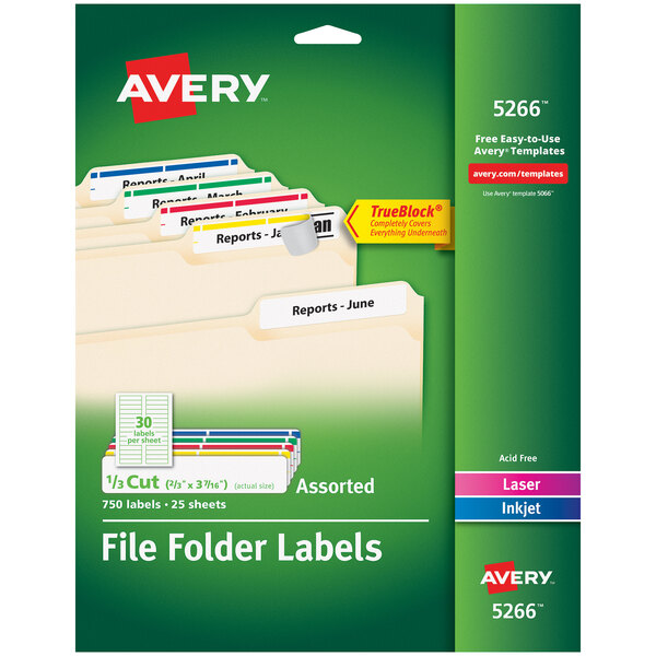 Avery 5266 - pfr.luxnoire.shop Avery ® TrueBlock File Folder Labels. Permanent Adhesive - Rectangle - Laser, Inkjet - Blue, Green, Red, White, Yellow - Paper - 30 / Sheet - 25 Total Sheets - 750 Total Label (s) - 750 / Pack. Item: AVE5266. Manage and identify files efficiently using the colored stripe over the white label surface for effective color coding and organizing.