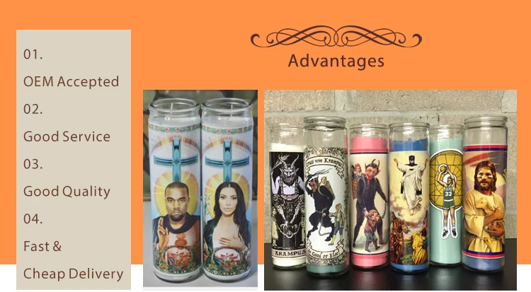 7 Day Prayer Candles, Chakra Church Candles, Mexican Religious Candles The memorial candle lid can be made with glass, metal, plastic. The spiritual candle can be single color, double color, multi-colors. If you have special requirement, we can also custom chakra candles, 5 day candles, or 9 day candles. About the vigil candle design, there are 3 types: sticker label, silkscreen, transparent stickers.