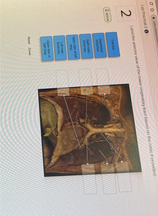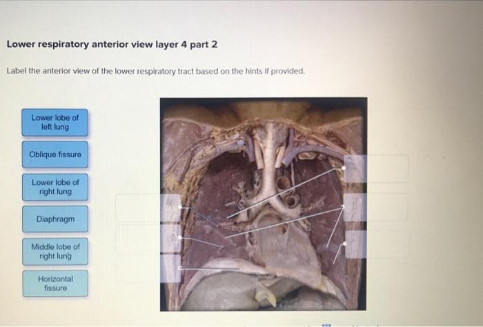 Label the anterior view of the lower respiratory tract. Surface ... Label the structures indicated on this anterior view of the Internal anatomy of the heart model. Left ventricle 0.37 points Right ventricle Skipped Left atrium References Pulmonary semilunar valve Lolt AV Valve (blouspid or mitral) Right atrium Right AV valve (tricuspid) Zoom Reset Unit 6 Flashcards | Quizlet Label the anterior view of the lower respiratory tract based on the hints if provided. 2 View the illustration, and drag the labels to their appropriate place. 4 Label the photomicrogram of the trachea. Label the anterior view of the larynx based on the hints if provided. Place the different partial pressure of gases with the appropriate location. Solved 23. value: 0.50 points Label the anterior view of the - Chegg Anatomy and Physiology questions and answers. 23. value: 0.50 points Label the anterior view of the lower respiratory tract based on the hints if provided. Oblique fissure Middle lobe of right lung Diaphragm Lower lobe of left lobe Lower lobe of right lung Horizontal fissure Reset Zoom 25. value: 0.50 points Place the different partial pressure ...