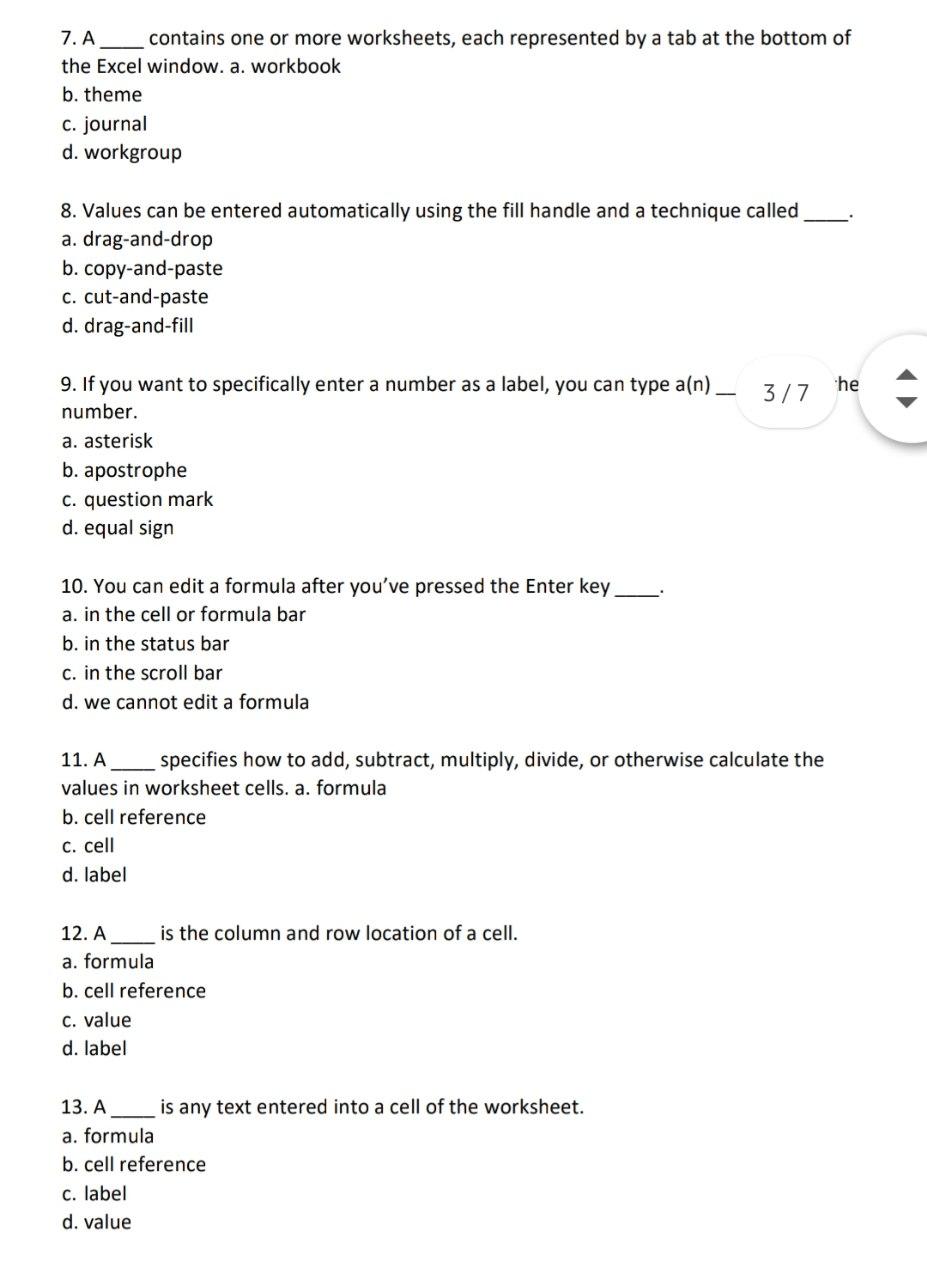 CSC 110 - Excel Quiz Flashcards | Quizlet What must you do to enter a number as a label in a cell? Press spacebar before typing the number. Type an open parenthesis before the number. Type an apostrophe before the number. Format the number as a label. Type an apostrophe before the number. Which of the following simplifies the process of entering the months of the year in a worksheet?