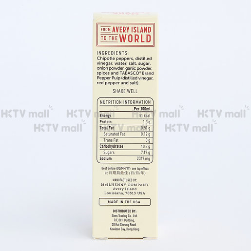 Tabasco Chipotle Pepper, 5 Ounce : Hot Sauces - Amazon.com Nutrition Facts Calories 0 Total Fat 0 Grams Saturated Fat 0 Grams Sodium 120 MG Sugars <1 Gram Protein 0 Grams Nutritional Information Ingredients Chipotle Pepper Distilled Vinegar Water Salt Sugar Onion Powder Garlic Powder Spices TABASCO brand Pepper Pulp (distilled vinegar, red pepper, salt)