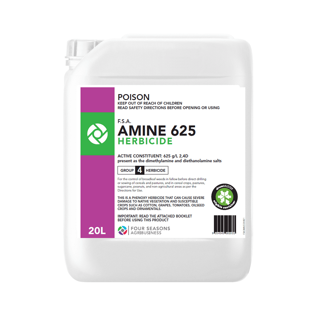 PDF Sipcam Amine 625 Herbicide AMINE 625 SELECTIVE HERBICIDE ACTIVE CONSTITUENT: 625g/L 2,4-D present as the dimethylamine and diethanolamine salts GROUP I HERBICIDE For the control of broadleafed weeds in fallow before direct drilling or sowing of cereals and pastures; and in cereal crops, pastures, sugar cane, peanuts and non-agricultural areas as per the Directions for Use. PDF F.S.A. AMINE 625 - Four Seasons Agribusiness F.S.A. AMINE 625 HERBICIDE | 1 of 21 APVMA Approval No.: 87152/128183 FOUR SEASONS AGRIBUSINESS POISON KEEP OUT OF REACH OF CHILDREN READ SAFETY DIRECTIONS BEFORE OPENING OR USING ACTIVE CONSTITUENT: 625 g/L 2,4D present as the dimethylamine and diethanolamine salts For the control of broadleaf weeds in fallow before direct drilling